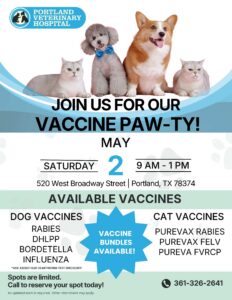 Join Us For Our Vaccine Paw-ty May 2nd from 9:00 am - 1:00 pm- Call For More Information!
