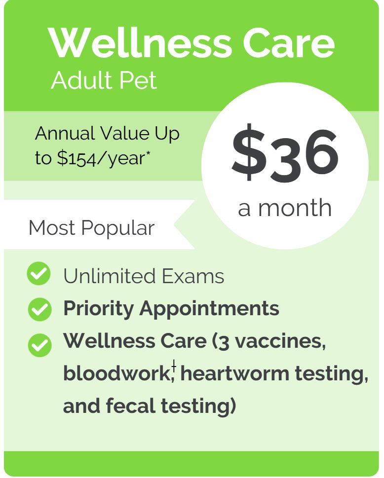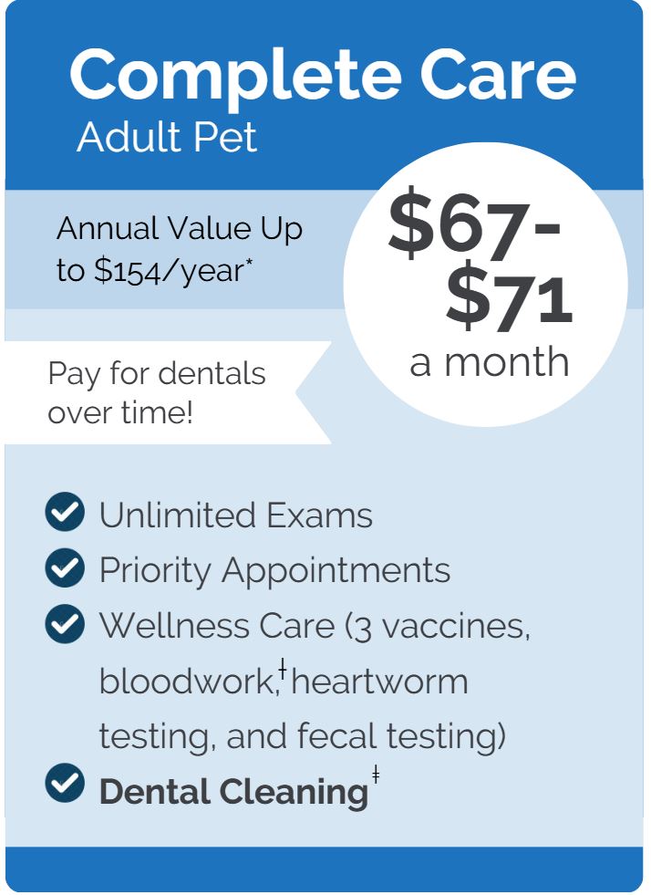 Plus, with our Wellness Care plans, you’ll enjoy priority appointments with same- or next-day scheduling whenever possible. Spread out the cost of services like dental care throughout the year, so you can give your pet the care they need without any financial stress.